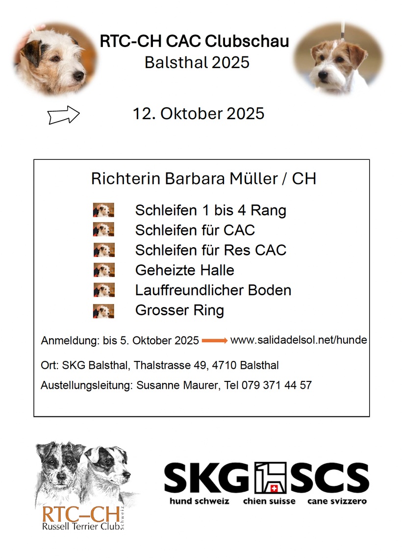 Die Veranstaltung wird durch den Russell Terrier Club (www.rtc-ch.ch) durchgeführt und findet am SONNTAG 12.10.2025 in Balsthal (Thalstrasse 49, Halle bei SKG Hauptsitz) statt.